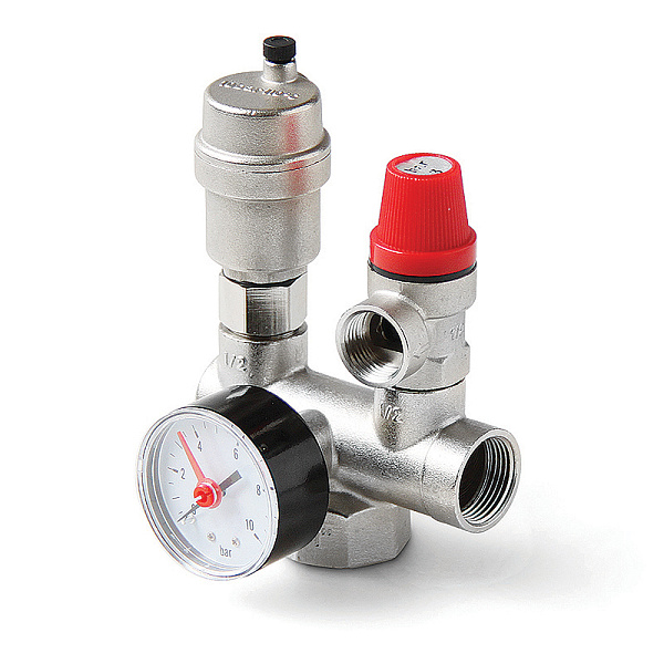 Группа безопасности защищает систему отопления от повышенного давления, автоматический воздухоотводчик удаляет воздух из системы, с помощью манометра производит индикацию давления в системе. Группа имеет дополнительный резьбовой выход для присоединения расширительного бака. Группа безопасности комплектуется автоматическим поплавковым воздухоотводчиком с отсечным клапаном, предохранительным клапаном, манометром.