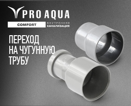 Переход PRO AQUA на чугунную трубу с муфтойКомпания «Про Аква» единственный из российских производителей, который имеет в своем ассортименте канализационных полипропиленовых фитингов не только традиционный переход на чугун, но и аналогичное изделие, совмещенное с муфтой. Фитинг используется при реконструкции системы внутренней канализации в многоквартирном доме, когда возникает необходимость перейти с чугунной канализации, зачастую советского производства, на современные пластиковые системы